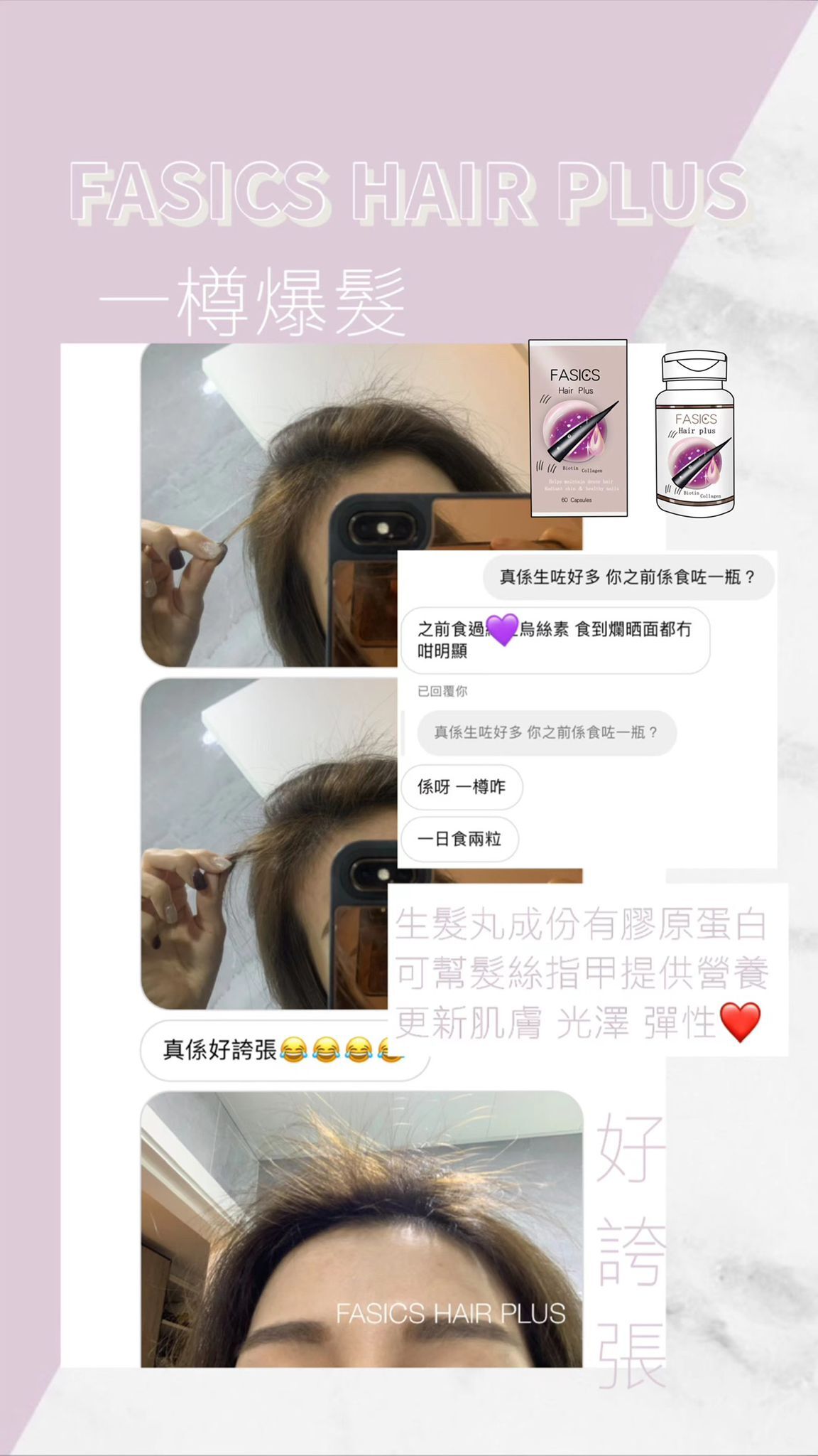 Fasics Hair Supplement 髮絲膠原補充品以高純度 膠原蛋白 + 生物素(Biotin)+ 頭髮營養複合配方,從體內激活毛囊,改善脫髮與髮絲斷裂,令頭髮重新變得: