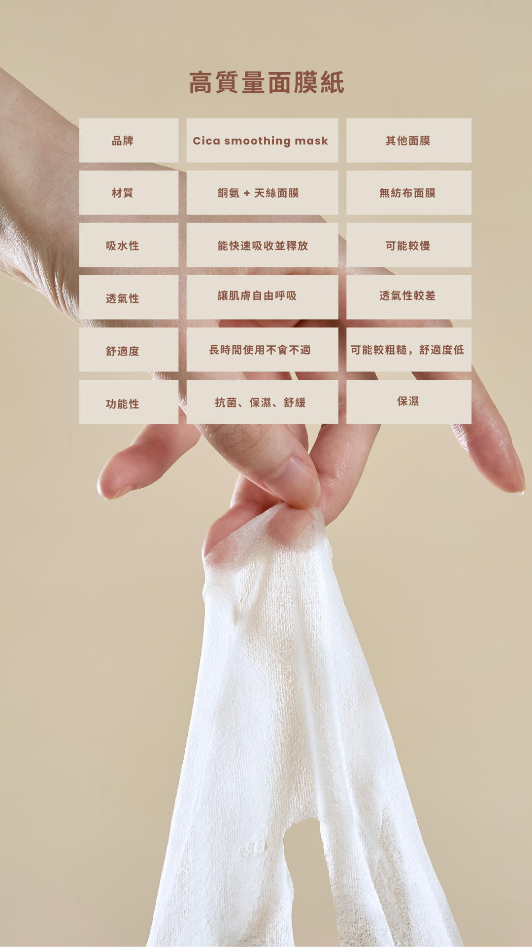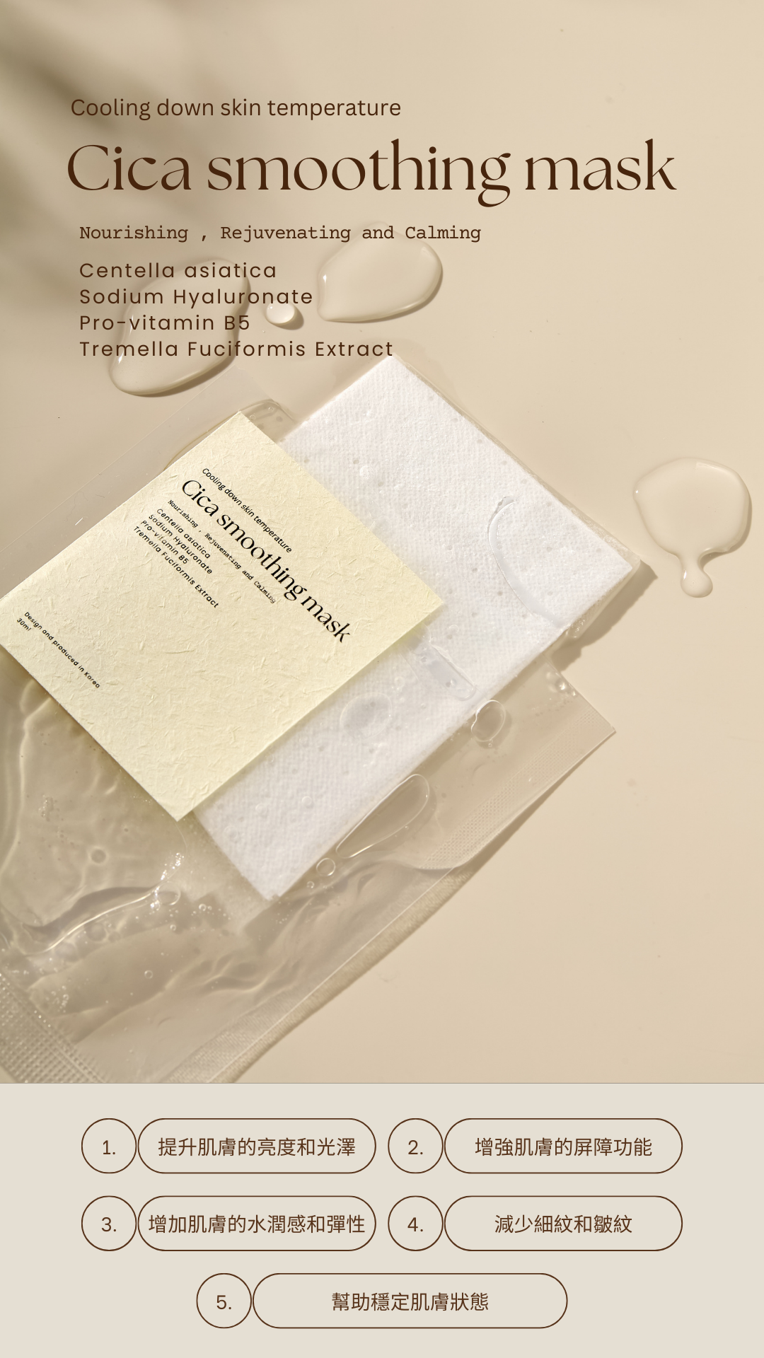 韓國院線等級的積雪草修復痘痘面膜(CICA Smoothing Mask),以高濃度積雪草精華結合舒緩抗炎成分,有效鎮靜泛紅、修復受損、改善痘痘及敏感不適。面膜布柔軟貼膚,能將精華均勻滲透肌底,令肌膚快速回復穩定、光滑與細緻。