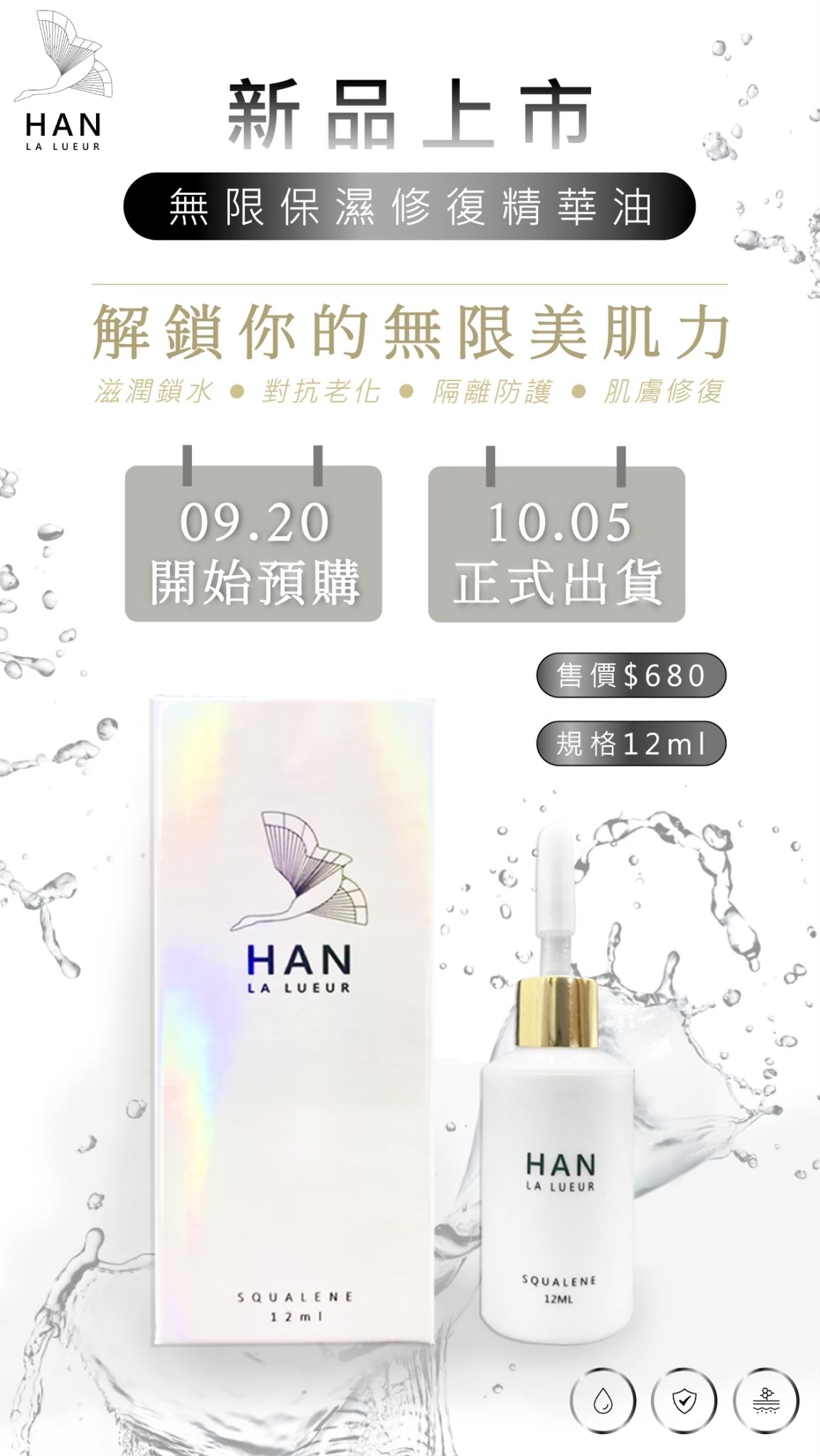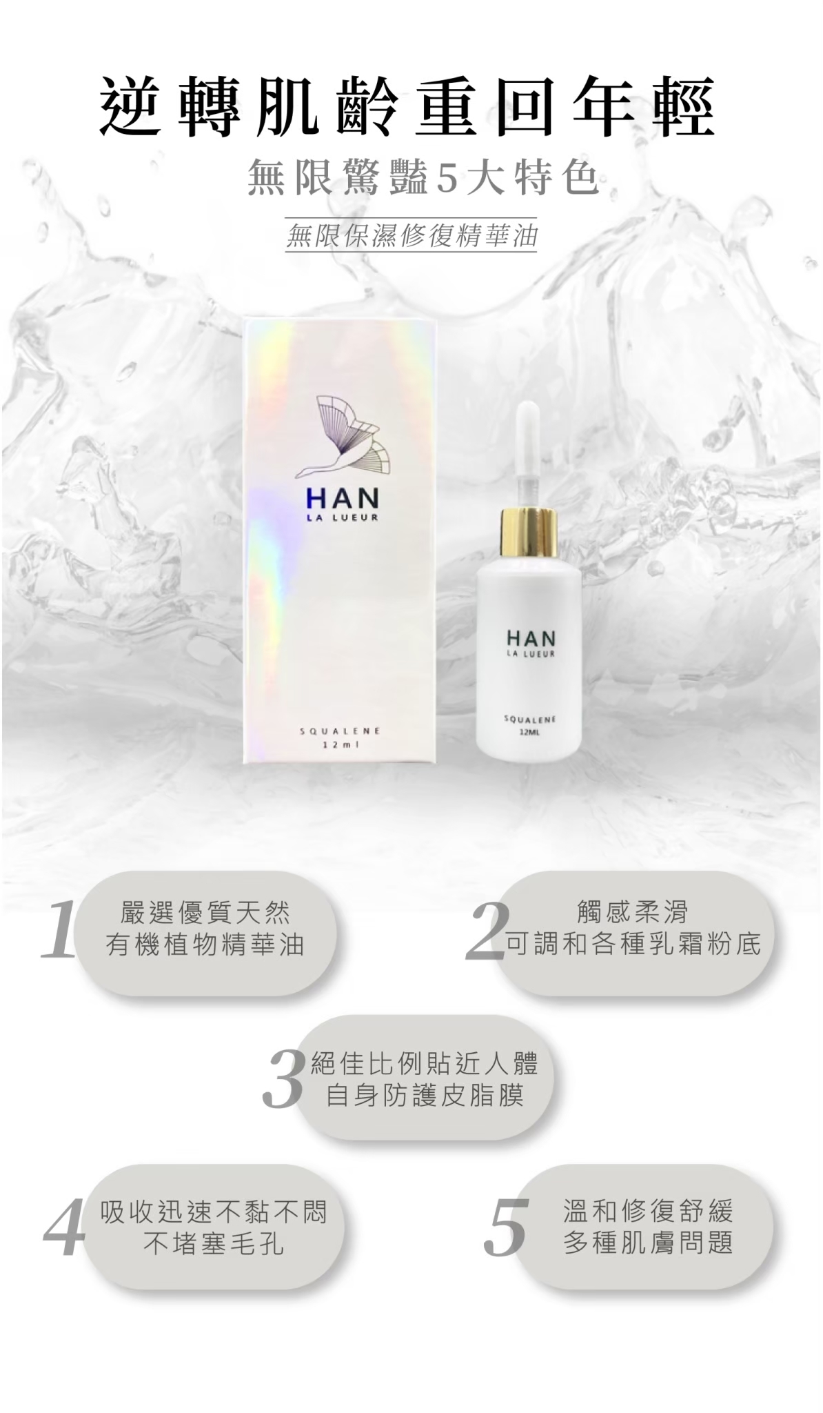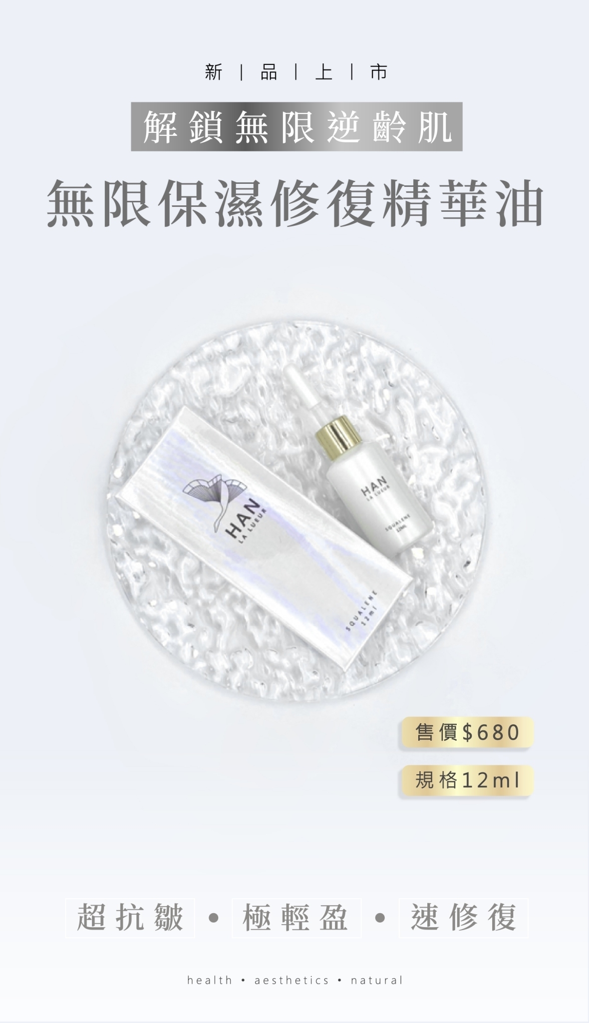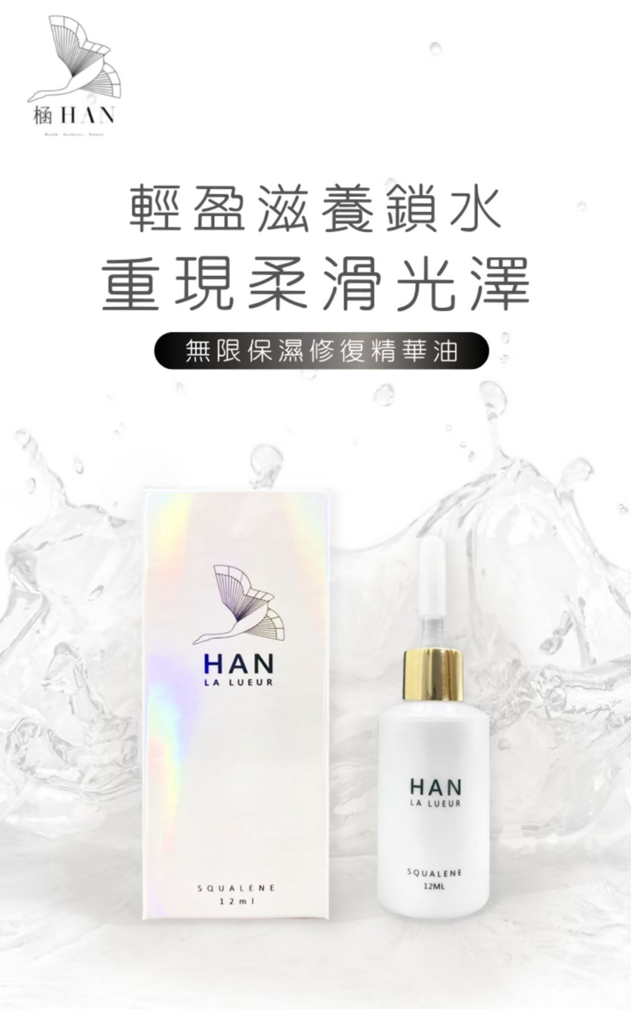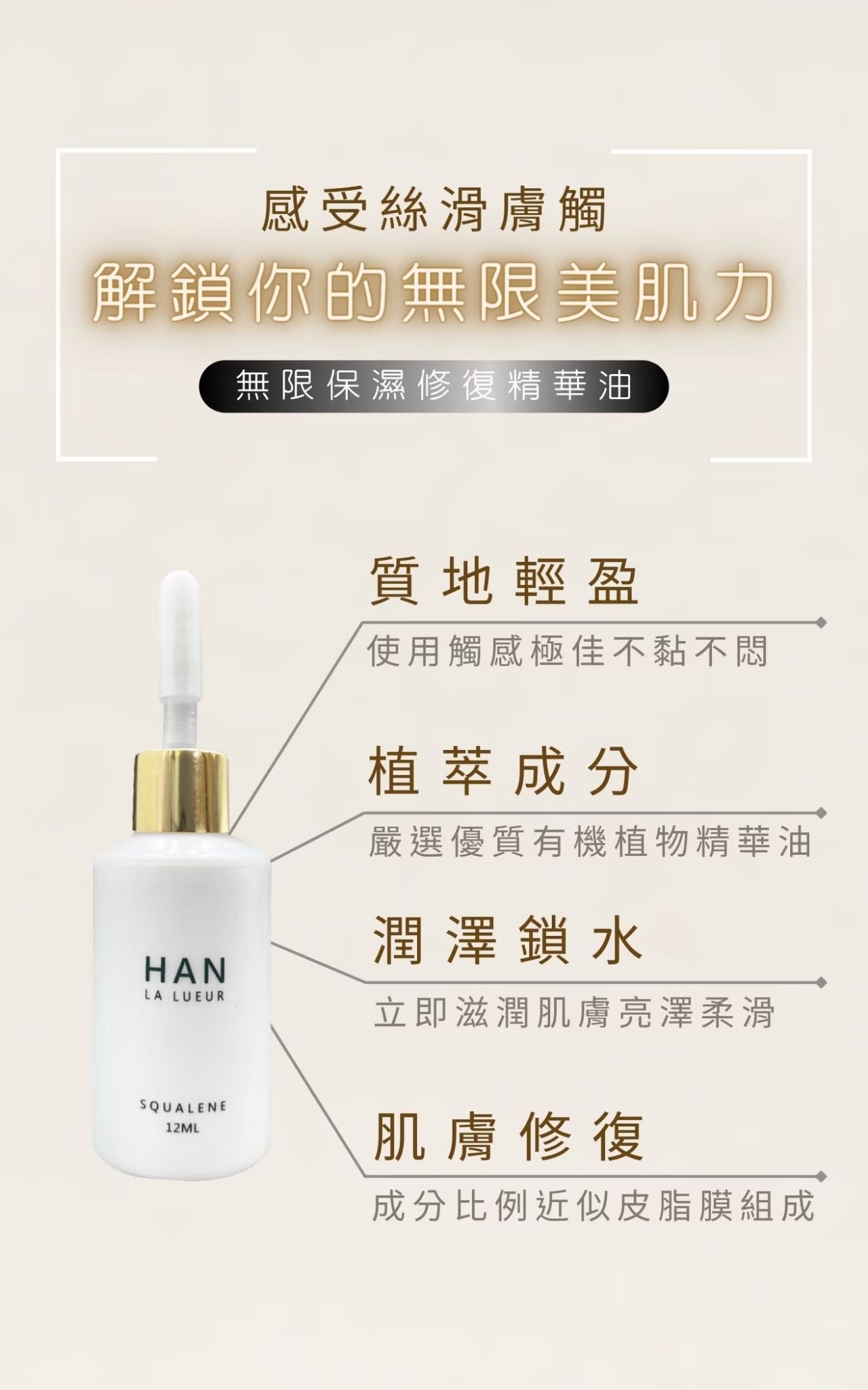 極HAN 無限保濕修復精華油結合高效植物油與修復因子,深層滋潤並強化肌膚屏障,同時改善乾燥、粗糙與暗啞,使肌膚柔嫩、亮澤、有彈性。