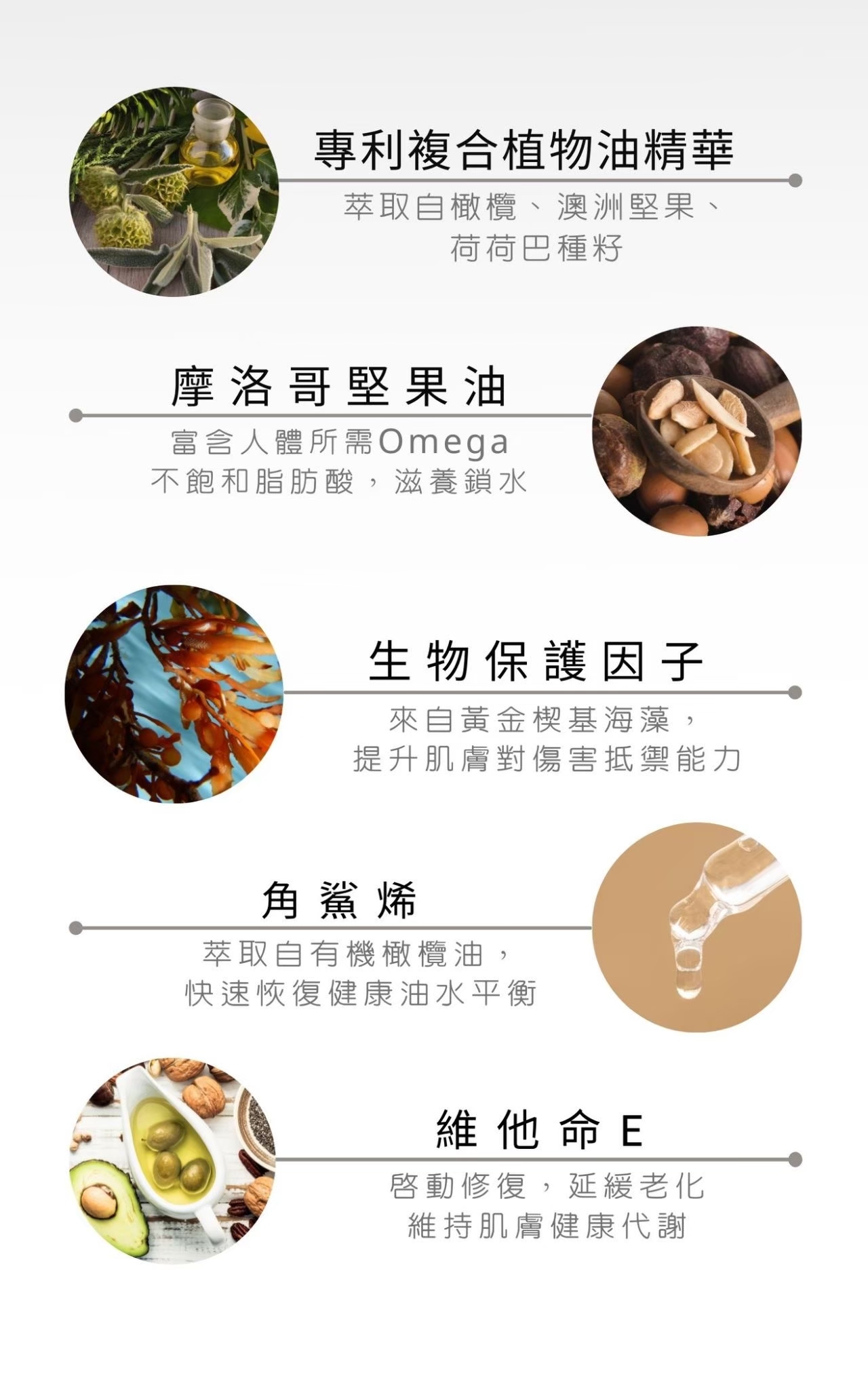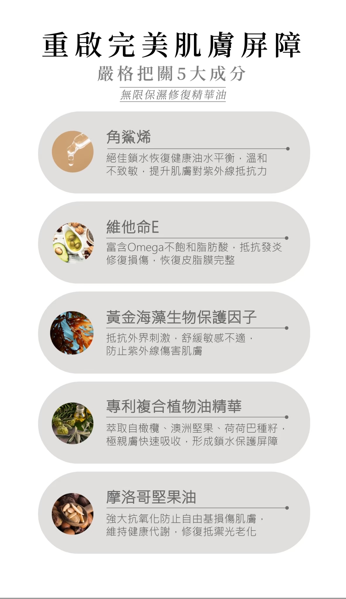 極HAN 無限保濕修復精華油選用高滲透植物油(如角鯊烷、荷荷芭、玫瑰果等類型成分),能快速進入肌底補水鎖水,改善乾燥引起的粗糙及緊繃感。溫和修復因子能強化肌膚屏障,使肌膚更穩定柔嫩,重拾自然光澤。