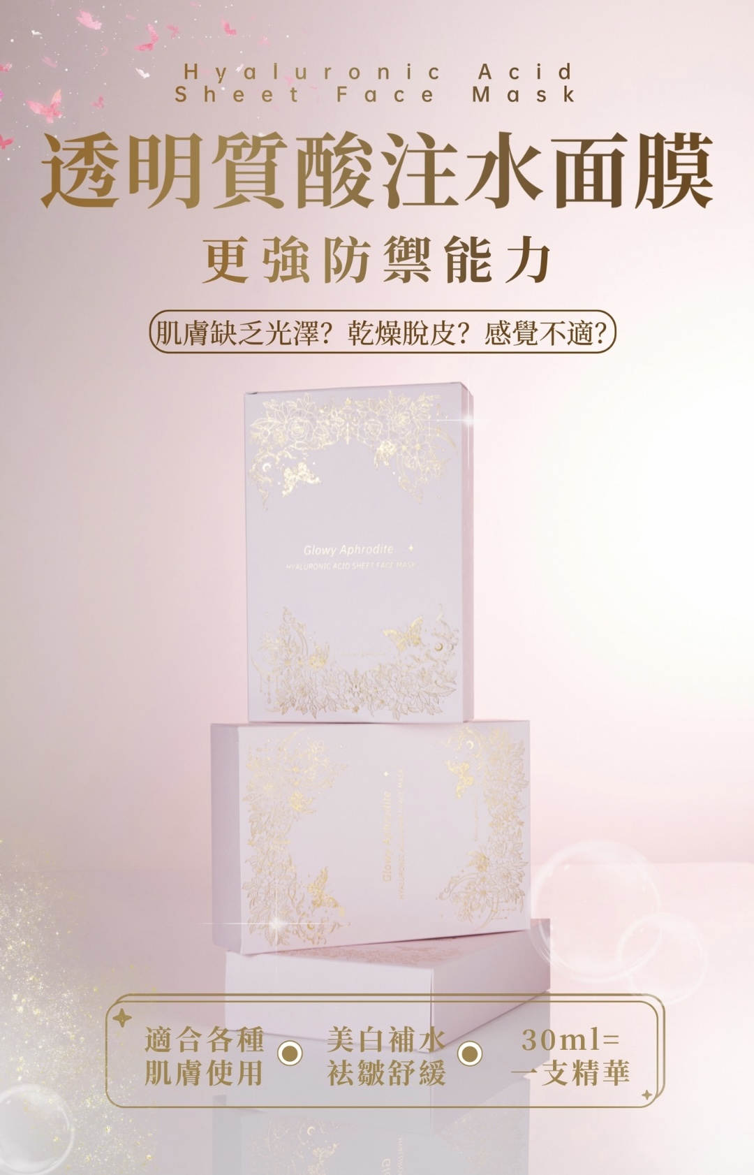 這款玻尿酸保濕面膜富含多重玻尿酸與深層補水成分,能迅速為肌膚注入大量水份,改善乾燥、粗糙、緊繃與暗啞問題。柔軟貼服的面膜布有效將精華均勻滲透肌底,敷後肌膚立刻變得水嫩、飽滿、柔滑、有光澤,是乾燥缺水肌膚的必備急救面膜。