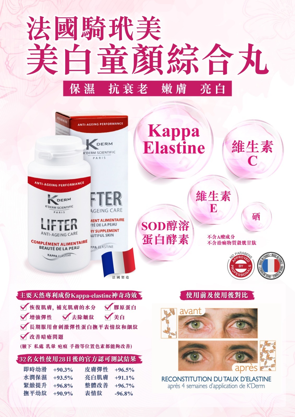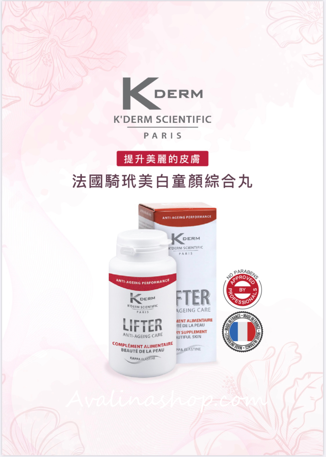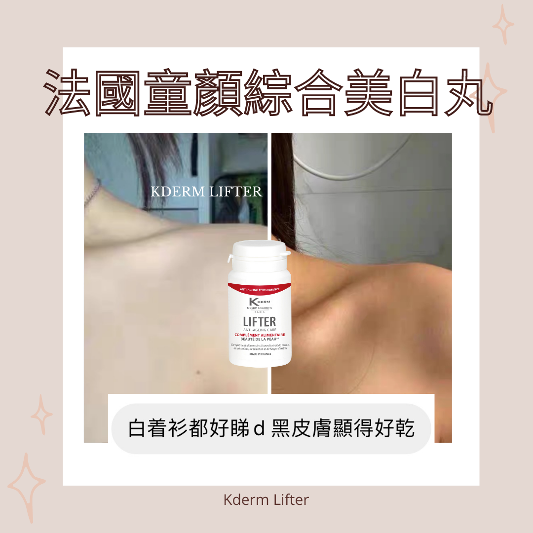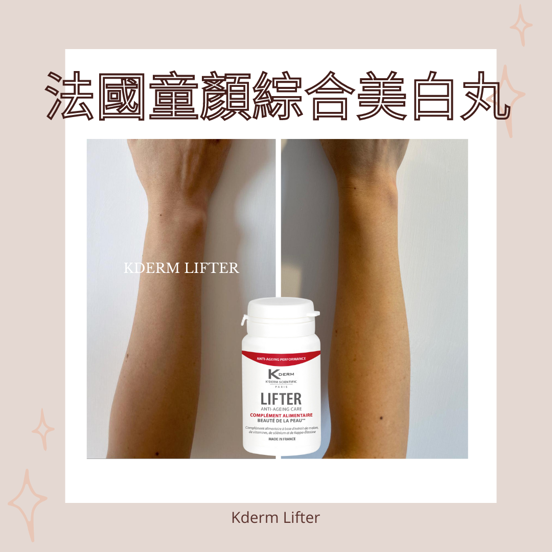 K’derm 童顏綜合美白丸由法國研製,以亮白抗氧化複方打造,能改善暗沉、均勻膚色、提升肌膚光澤,使膚質更透亮細緻。