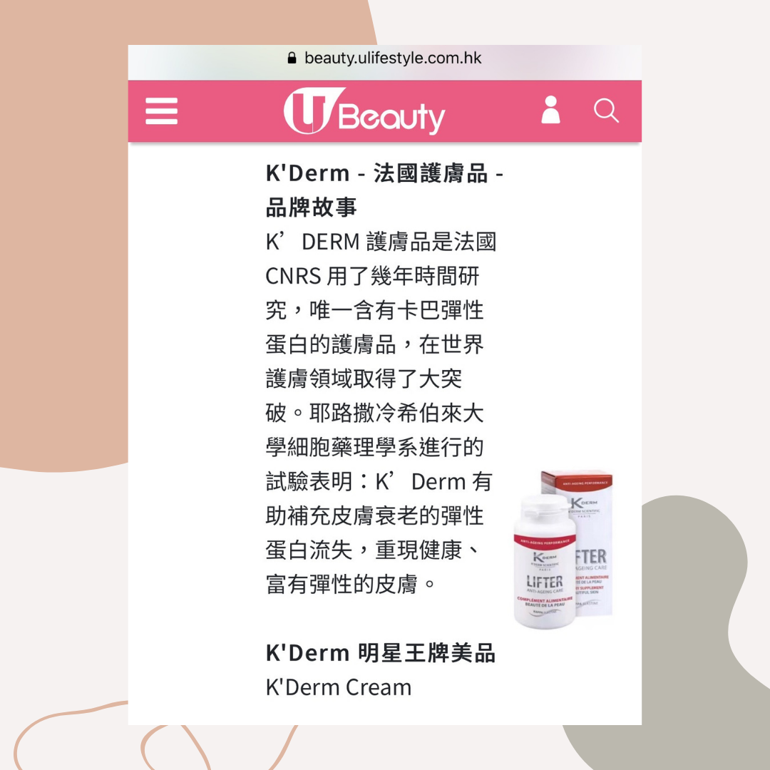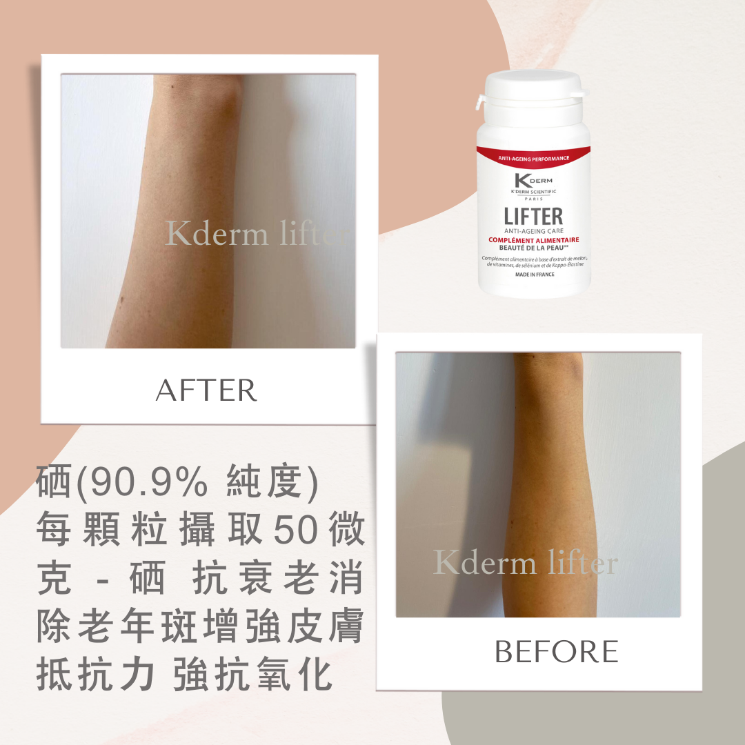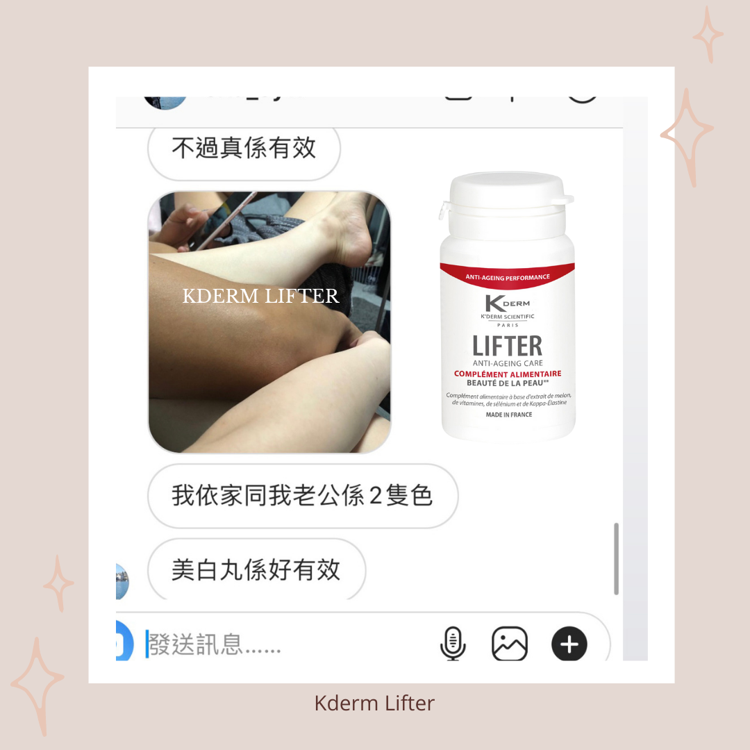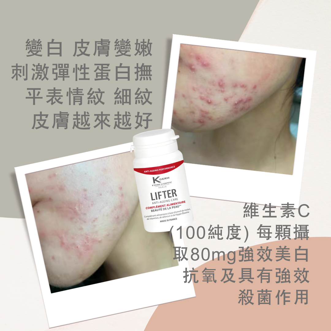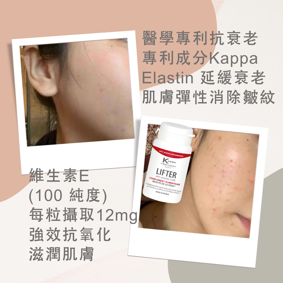 K’derm 童顏綜合美白丸由法國研製,以亮白抗氧化複方打造,能改善暗沉、均勻膚色、提升肌膚光澤,使膚質更透亮細緻。