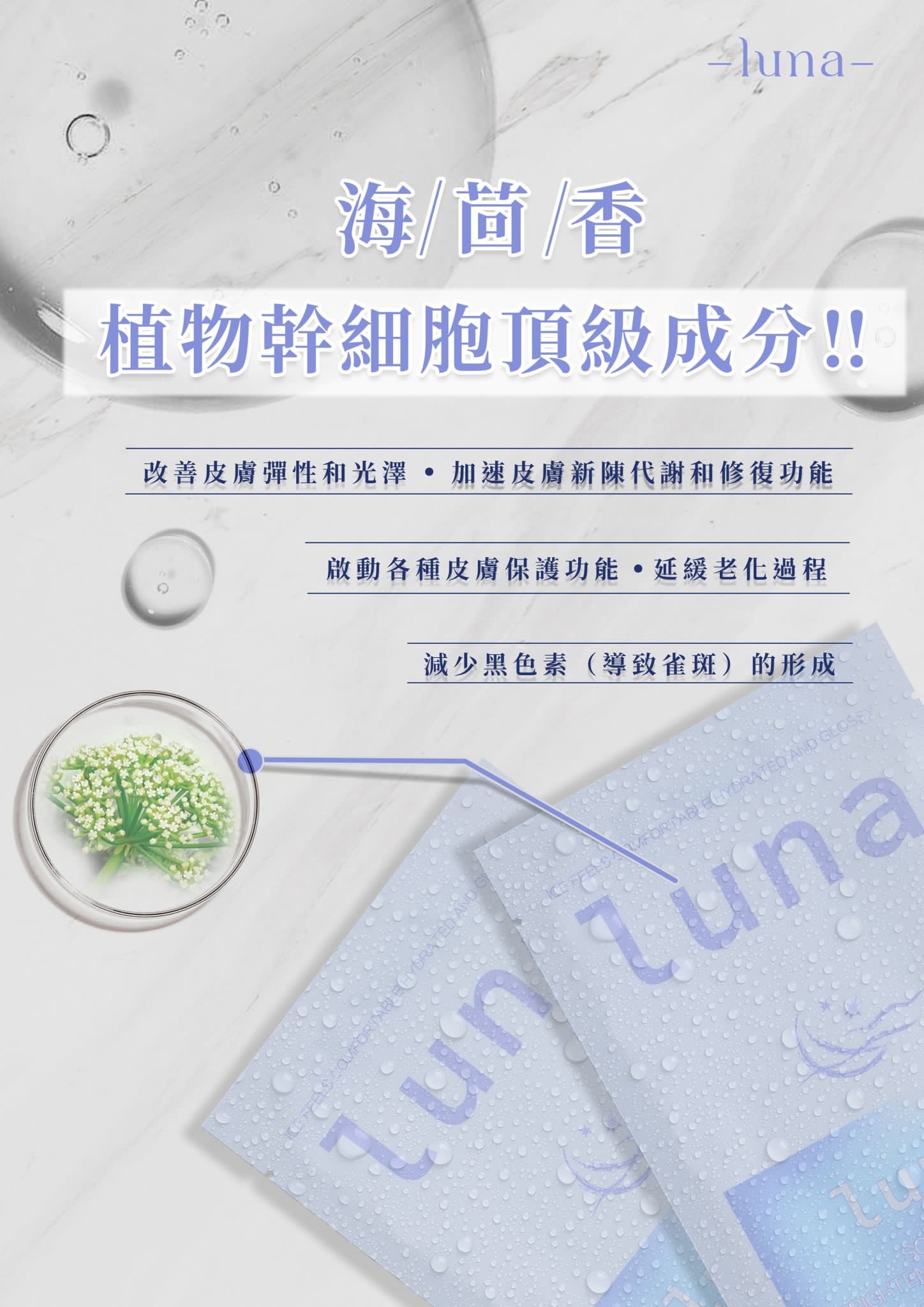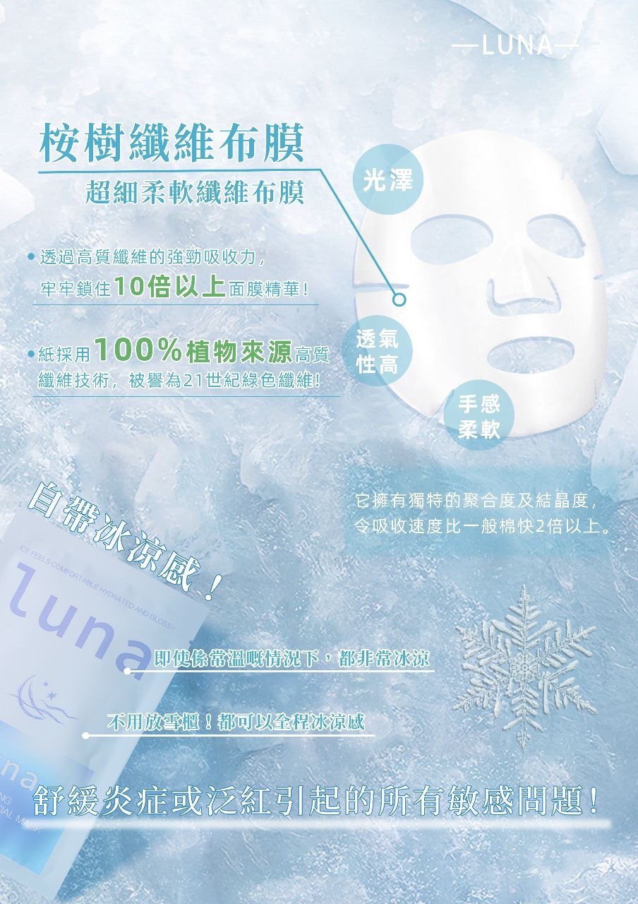 LUNA 冰感植物幹細胞面膜以冰涼舒緩配方結合高效植物幹細胞精華,能有效降紅鎮靜、深層補水、修復肌底,同時增強屏障,使肌膚重回穩定水嫩。