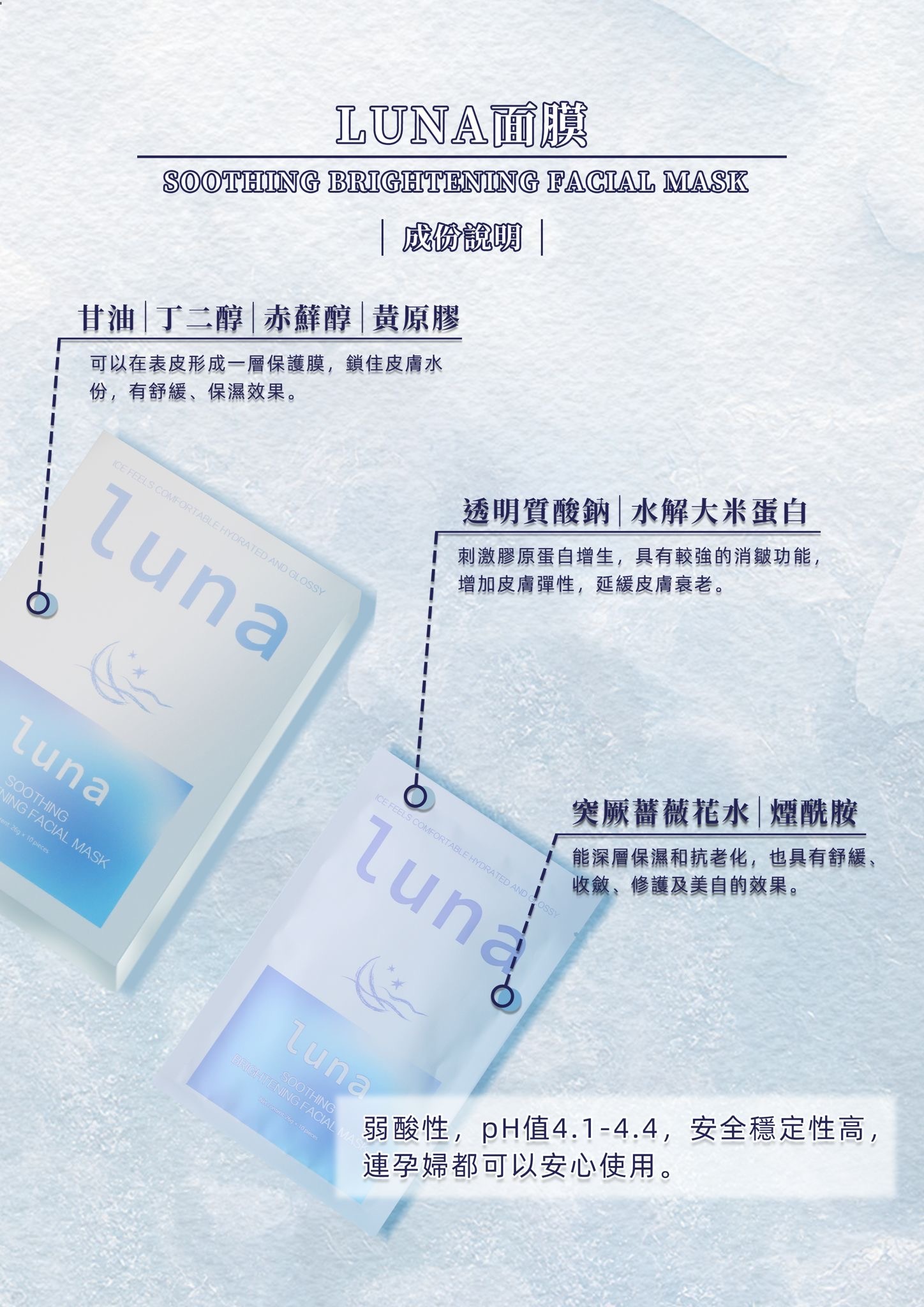 LUNA 冰感植物幹細胞面膜擁有冰涼舒緩觸感,能迅速降溫鎮靜泛紅與敏感不適,搭配植物幹細胞高效修復精華,能深入肌底補水、修護乾燥粗糙,強化肌膚屏障並提升穩定度。