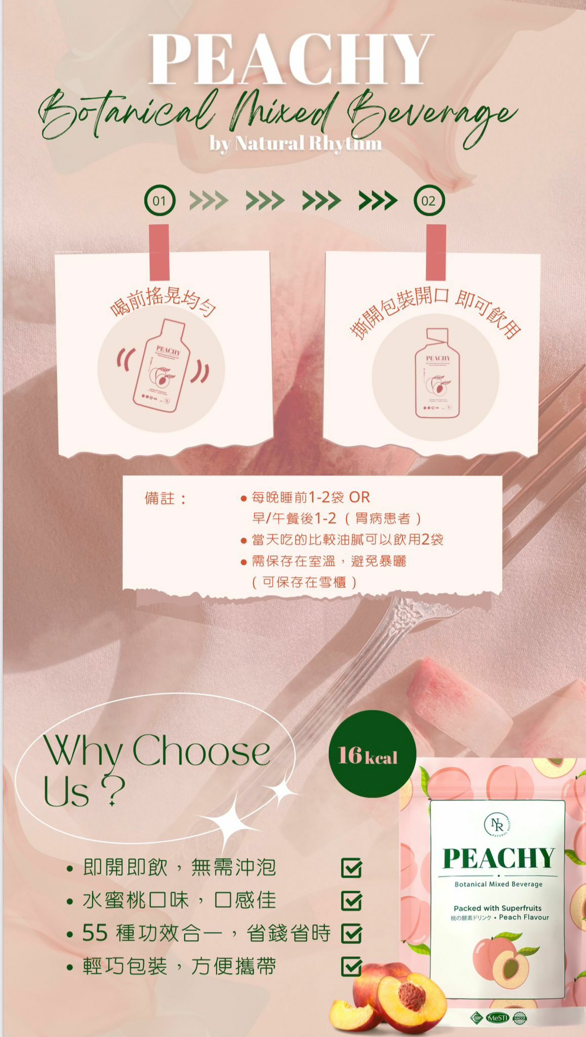 Peachy 桃の酵素飲以天然水果酵素為基底,能溫和促進腸道蠕動、改善排便、減少水腫並維持身體代謝循環。配方清爽易飲,適合日常保養、餐後調理或消化不順時飲用,幫助身體更輕盈、腸道更舒適。