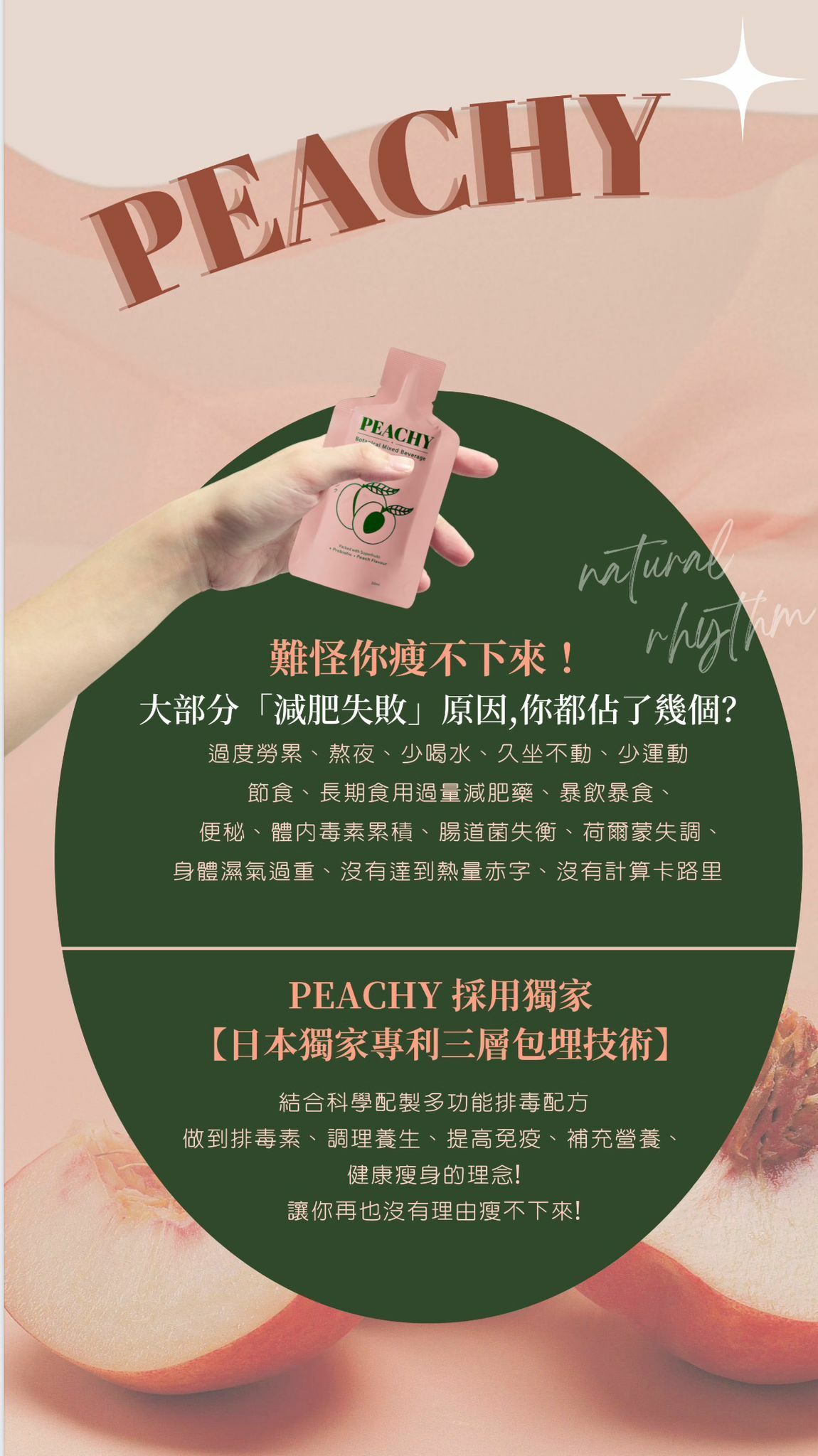 •服用之後隔天需飲用3公升以上的水,能加速新陳代謝,讓PEACHY 更好的吸收,也可以配合運動,以達到更好的瘦身效果。